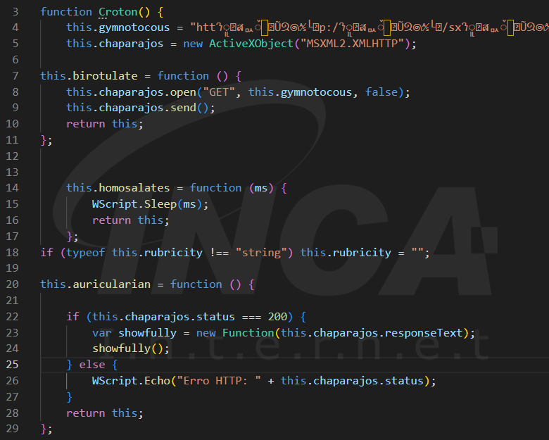 최초 공격이 시작되는 PO_E002594522.js 파일은 난독화된 자바스크립트다. 난독화된 스크립트가 실행되면 ActiveXObject 를 생성해 또 다른 난독화된 자바스크립트를 외부에서 다운로드한 후 파일리스 방식으로 실행한다.