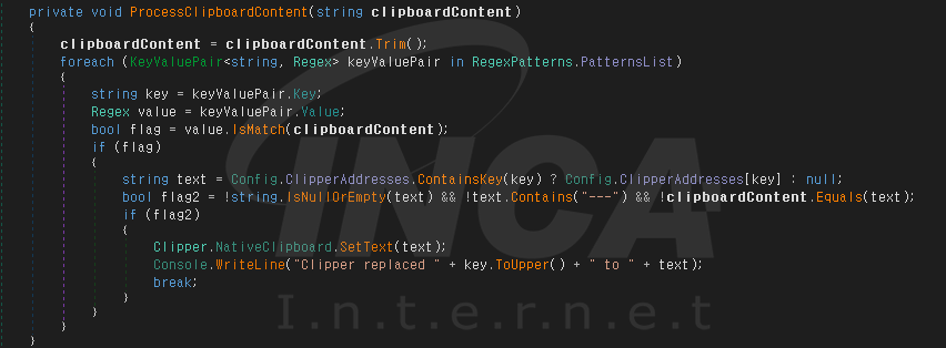 시스템이 가상 환경이 아니라고 판단되면 설정에 명시된 프로그램으로부터 브라우저 쿠키, 인증 정보, 암호 화폐 지갑 주소와 같은 민감한 정보를 수집한다. 그 뿐만 아니라 키로깅 기능을 통해 사용자의 키보드 입력을 가로채거나, 클립보드에 암호 화폐 지갑 주소가 탐지될 시 공격자가 지정한 지갑 주소로 코인이 전송되도록 지갑 주소를 바꿔치기하는 하이재킹 공격도 시도한다.
