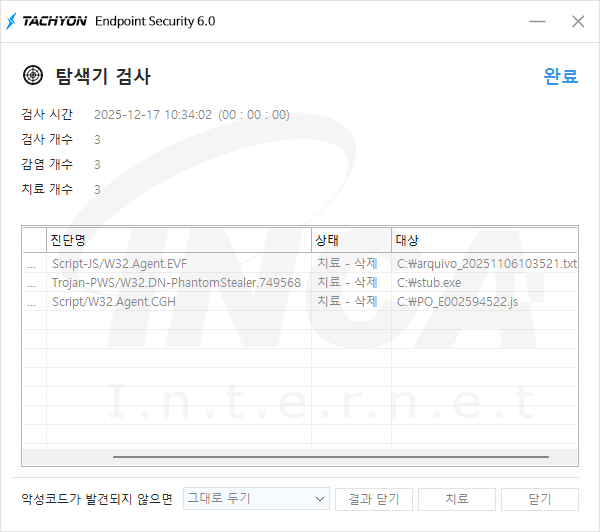 상기 악성코드는 잉카 인터넷 안티바이러스 제품 TACHYON Internet Security 6.0에서 진단 및 치료가 가능하다.
