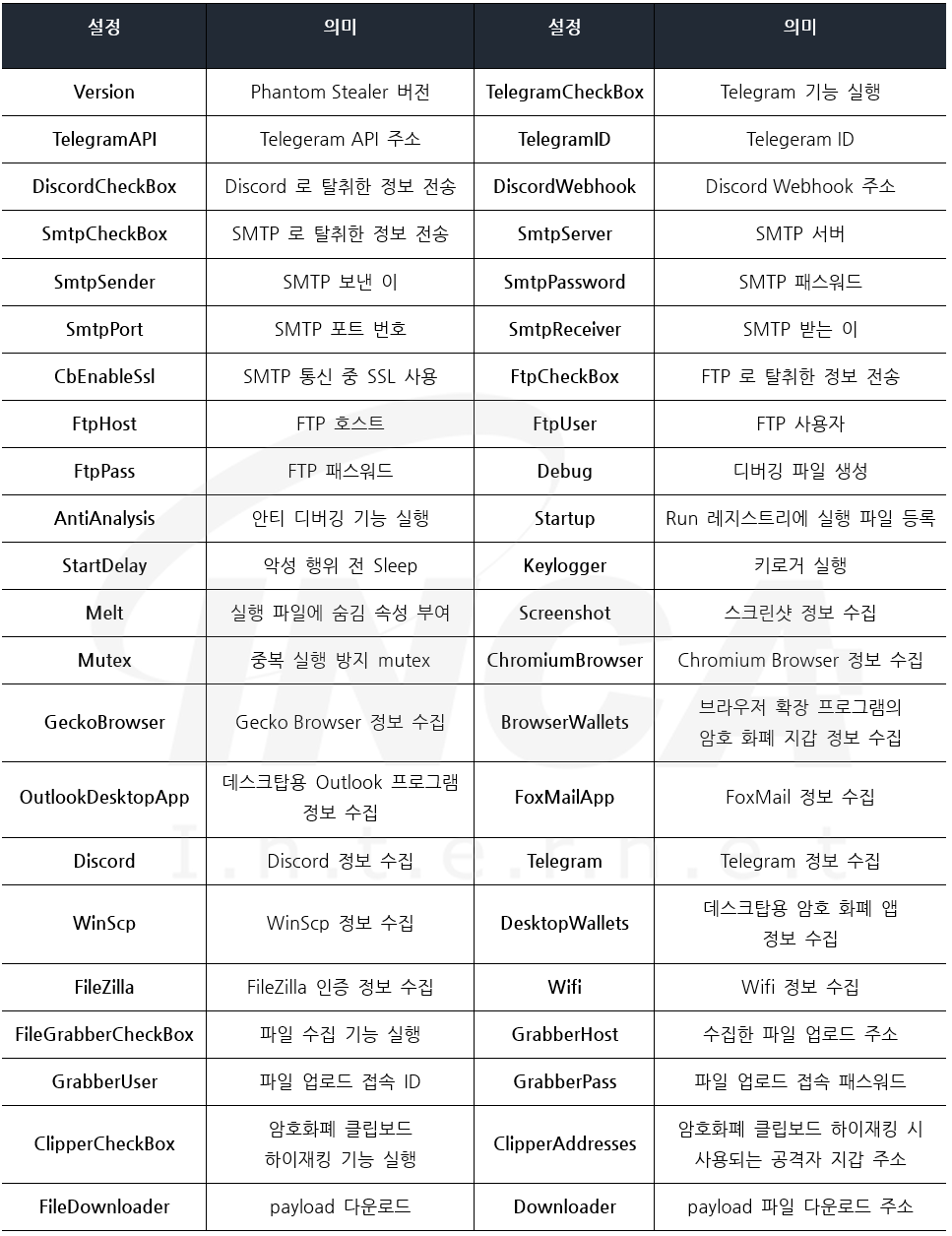 Phantom Stealer 는 모듈화된 악성 기능을 가지며, 빌드 시 생성된 설정 값에 따라 모듈의 실행 여부가 결정된다. [표 1]은 Phantom Stealer 에서 사용되는 설정 값과 의미를 보여준다.