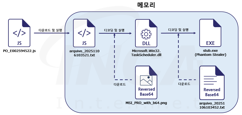 본 보고서에서 분석한 샘플은 다음과 같은 흐름에 따라 공격이 진행된다. 최초 실행되는 자바스크립트 이후의 후속 스크립트와 최종 페이로드(payload)는 디스크에 파일을 생성하지 않고 메모리상에서 즉시 실행되는 파일리스(Fileless) 기법을 사용한다. 공격 과정 중에는 이미지나 인코딩된 데이터 형태의 리소스를 다운로드하며 해당 파일 내부의 Base64 페이로드를 추출해 다음 단계로 전달한다.
