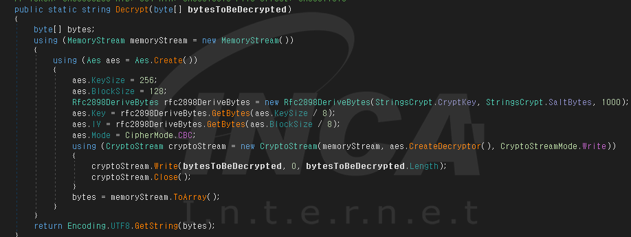 사용되는 문자열은 대부분 평문이지만 공격자 서버 주소, 인증 정보와 같이 중요한 정보는 암호화돼 저장되었다. 암호화된 문자열은 Base64 디코딩 후 PBKDF2 에 의해 생성된 값을 기반으로 AES 알고리즘으로 복호화 후 사용된다.