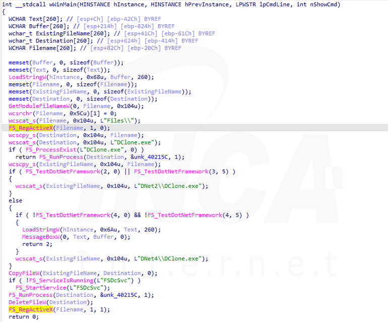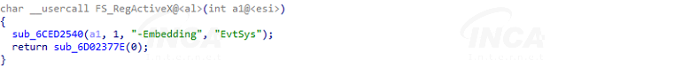 ToneShell의 FS_RegActiveX함수는 실행 인자 값을 확인하고 “-Embedding”으로 인자 값을 지정해 실행하면 악성 동작에 사용할 API 주소를 가져온다. 그리고 EvtSys를 인자 값으로 새 프로세스를 만들어 다시 실행하고 해당 프로세스에서 악성 동작을 수행한다.