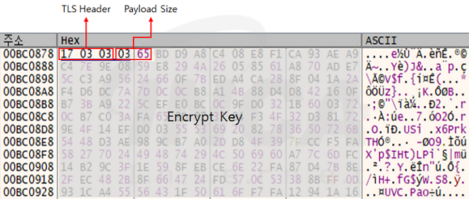 Random한 값을 일정한 연산식으로 계산해 0x300 길이의 암호화키를 생성한다. 이후 사용자 PC에서 시스템 정보를 수집한 데이터를 암호화한 뒤 맨 앞에 TLS 헤더(0x17, 0x03, 0x03)와 페이로드 크기를 추가하고 뒤이어 암호화 키와 암호화된 데이터를 덧붙여 공격자가 운영하는 C&C 서버로 전송한다.