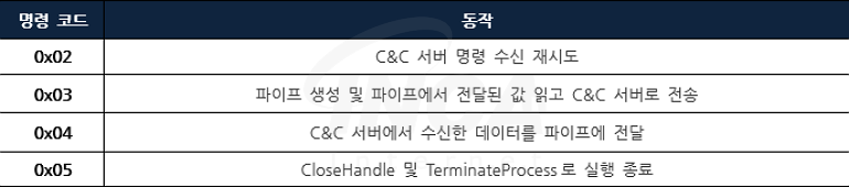 ToneShell은 공격자의 C&C 서버와 지속해서 통신을 시도하는데 수신되는 코드 및 동작 별로 유형을 나눌 수 있다. 분석 시점 당시 공격자의 C&C 서버가 응답하지 않아 일부 명령 코드에 대한 동작이 불명확할 수 있다.