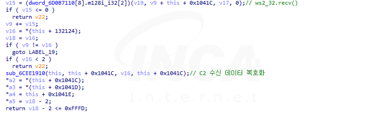 C&C 서버와 통신에 성공해 서버로부터 패킷을 수신받으면 TLS 헤더를 확인하다. TLS 패킷으로 확인되면 암호화된 데이터를 복호화한 뒤 명령 코드에 따라 동작을 수행한다.