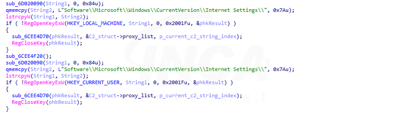 레지스트리 조회로 로컬 프록시 서버를 검색하고 설정돼있다면 해당 레지스트리에 C&C 서버 주소를 등록한다. HTTP 소켓에 C&C 서버 주소를 설정하고 통신을 시도하며 주고받는 패킷에 TLS 헤더 값을 추가해 TLS 패킷처럼 보이게 한다.