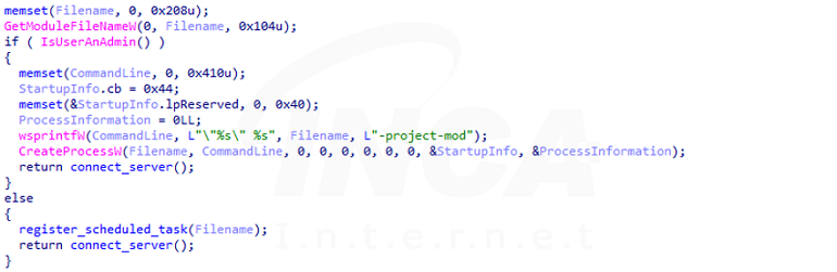 Yokai 백도어가 실행되면 IsUserAdmin API를 사용해 현재 프로세스의 실행 권한을 확인하고 관리자 권한일 경우 자기 자신을 계속해서 다시 실행해 시스템에 부하를 건다. 관리자 권한이 아닐 경우에 작업 스케줄러를 등록해 자동 실행을 설정하고 다음 동작을 수행한다.