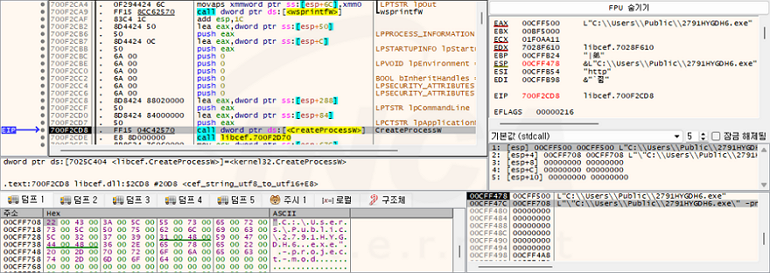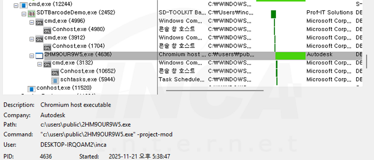 SnakeDisk는 USB 웜 악성코드로 실행 시 파라미터로 “-Embedding”이 입력되면 USB 장치 및 Yokai 백도어 배포 동작을 수행하며 “-hope”가 입력되면 감염 동작 없이 바로 Yokai 백도어를 드롭 및 실행한다. ADS 방식과 마찬가지로 SnakeDisk는 ‘Public’ 폴더에 정상 EXE 파일과 DLL 형태의 Yokai 백도어를 드롭한 후 “-project-mod”라는 파라미터와 함께 DLL 사이드로딩 방식으로 실행한다.