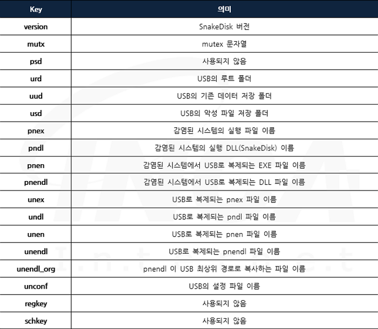 조건에 부합하는 파일을 발견하면 Payload를 반으로 나누고 앞의 절반은 정방향으로, 뒤의 절반은 역방향으로 XOR 연산하여 복호화한다. 복호화된 설정 데이터는 “key = value”와 같은 형식의 데이터를 연속적으로 가지며 각 설정 Key는 아래와 같은 의미를 가진다.