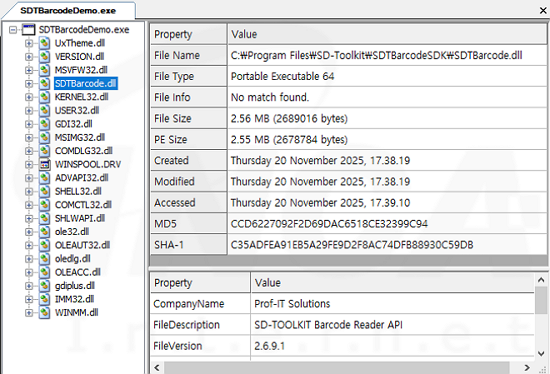 SnakeDisk 는 바코드를 읽는 프로그램 Barcode Reader SDK 의 실행 파일 중 하나인 “SDTBarcode.dll” 파일로 위장하고 있다. Barcode Reader SDK 의 구성 파일 중 하나인 “SDTBarcodeDemo.exe” 는 실행 시 “SDTBarcode.dll” 파일을 로딩하는 의존성을 가지며 공격자는 정상 “SDTBarcode.dll” 파일을 SnakeDisk 로 바꿔치기해 유포함으로써 정상 파일인 “SDTBarcodeDemo.exe” 가 실행될 시 악성 파일을 로딩하는 DLL 사이드로딩 기법을 사용한다.