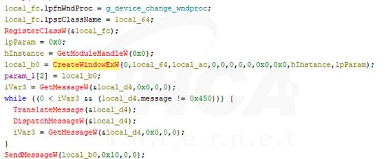 국가 코드 검증에 성공하면 “Global\<mutx>” 으로 mutex 생성을 시도한다. mutex 가 이미 존재하면 SnakeDisk 프로세스가 실행 중이라 판단하여 악성 행위 없이 종료된다. 앞서 설명한 조건을 모두 만족하면 USB 감염을 시작한다. USB의 연결/연결 해제를 감지하기 위해 보이지 않는 윈도우를 생성해 장치 변경 시 발생하는 메시지(WM_DEVICECHANGE)를 전달받고 처리한다.