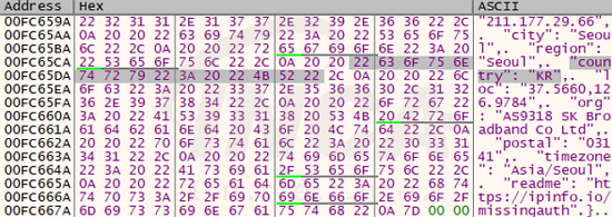 설정 파일 로딩 후 감염된 시스템은 “http://ipinfo.io/json” 에 접속해 현재 시스템의 네트워크 정보를 JSON 형식으로 수집한다. 이 데이터의 country 는 현재 시스템의 지리적인 정보와 관련된 국가 코드를 가진다. SnakeDisk 는 해당 값이 태국(TH 또는 THA)을 가리키는 경우에만 악성 행위를 실행한다.