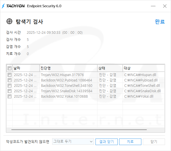 분석된 Pubload, Toneshell 및 Yokai 백도어 3종과 HIUPAN 및 SnakeDisk USB웜 2종은 아래와 같이 잉카인터넷 안티바이러스 제품 TACHYON Internet Security 6.0에서 진단 및 치료가 가능하다.