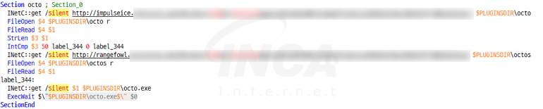 페이로드를 다운로드하는 동작은 설치 단계에서 수행되며 .nsi 스크립트의 Section 블록에서 해당 동작을 정의한다. Section 블록은 설치할 구성 요소를 정의하는 부분으로 파일, 레지스트리 및 실행 명령어 등을 설정할 수 있다. 현재 샘플의 Section 블록은 INetC.dll의 get 함수를 이용해 두 개의 URL에서 순차적으로 파일 다운로드를 시도하고 해당 파일에 저장된 또 다른 URL에서 파일을 다운로드해 octo.exe라는 이름으로 저장 및 실행한다.