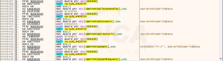 Lumma Stealer는 이와 같은 방식으로 네트워크 연결에 필요한 WinHttp 라이브러리의 API 이름을 복호화한 후 동적으로 로드해 사용한다. C&C 서버의 주소 또한 문자열 복호화를 이용해 획득하며 로드한 WinHttp API를 이용해 통신을 시도한다.