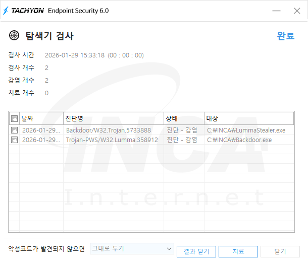 상기 악성코드는 잉카인터넷 안티바이러스 제품 TACHYON Internet Security 6.0에서 진단 및 치료가 가능하다.