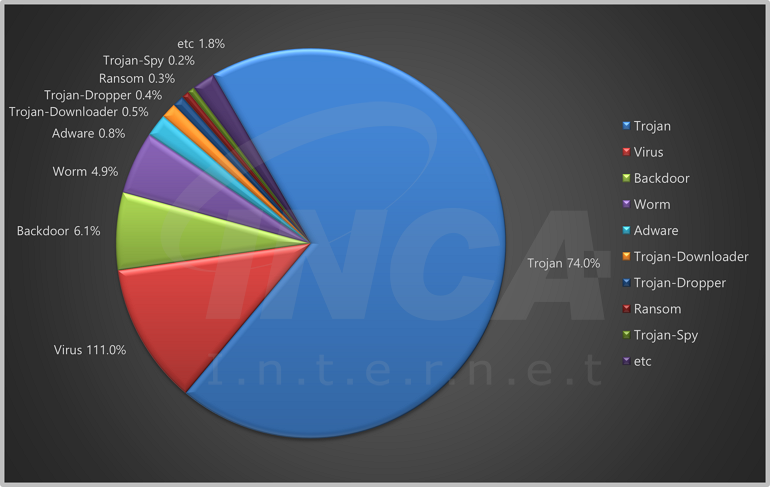 2026년 2월(2월 1일 ~ 2월 28일) 한 달간 잉카인터넷 시큐리티대응센터는 국내외에서 수집된 악성코드 현황을 조사하였으며, 유형별로 비교하였을 때 Trojan이 74%로 가장 높은 비중을 차지했고, Virus가 11%로 그 뒤를 따랐다.