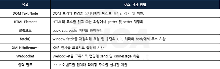 interceptor.js는 암호화폐 지갑 주소를 탐지해 공격자의 지갑 주소로 치환하는 메인 동작을 수행한다. 해당 스크립트는 DOM(Document Object Model), 클립보드 및 fetch() 메서드를 포함한 [ 1]의 목록을 대상으로 텍스트 데이터를 읽고 암호화폐 지갑 주소를 실시간으로 수정한다.