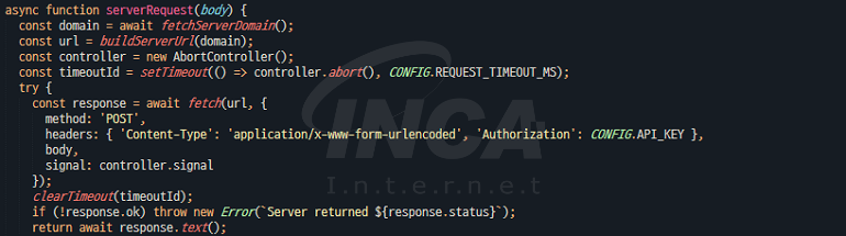 이벤트 핸들러로 지정된 service-worker.js는 공격자가 운영하는 C&C 서버 관련 동작을 수행한다. 해당 스크립트는 확장 프로그램의 설치 및 실행 이벤트를 감지해 refresh, domain cache-cleanup이라는 이름의 알람을 등록하고 각각의 알람은 10, 60, 15분마다 반복되도록 설정한다. 이후 알람 이벤트를 대기하다가 refresh 알람을 수신하면 C&C 서버와의 연결 상태를 점검하고 domain을 수신하면 C&C 서버로부터 새로운 주소를 받아와 교체한다. 새로운 서버 주소는 크롬 로컬 스토리지에 저장되며 cache-cleanup 알람 수신 시 로컬 스토리지에 저장된 주소를 삭제한다.