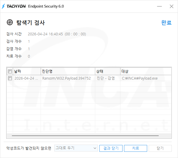 상기 악성코드는 잉카인터넷 안티바이러스 제품 TACHYON Internet Security 6.0에서 진단 및 치료가 가능하다.