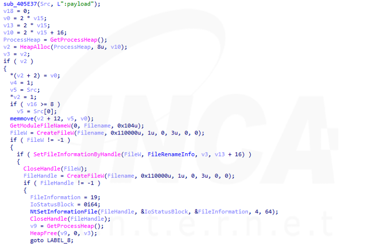 실행 옵션 중 d 는 NTFS의 ADS(Alternate Data Stream) 기능을 악용해 자기 자신의 파일명 끝에 :payload을 부여하며 파일을 ADS 영역으로 이동시킨다. ADS는 NTFS 파일 시스템에서 하나의 파일에 본래 데이터 외 추가 데이터 스트림을 숨겨 저장할 수 있는 기능으로서 파일 탐색기 등 일반적인 환경에서는 보이지 않는다. 랜섬웨어 자기 자신을 ADS영역으로 은닉한 뒤, NtSetInformationFile 함수에 FileDispositionInformationEx(64) 인자값을 지정하여 해당 파일을 삭제한다.
