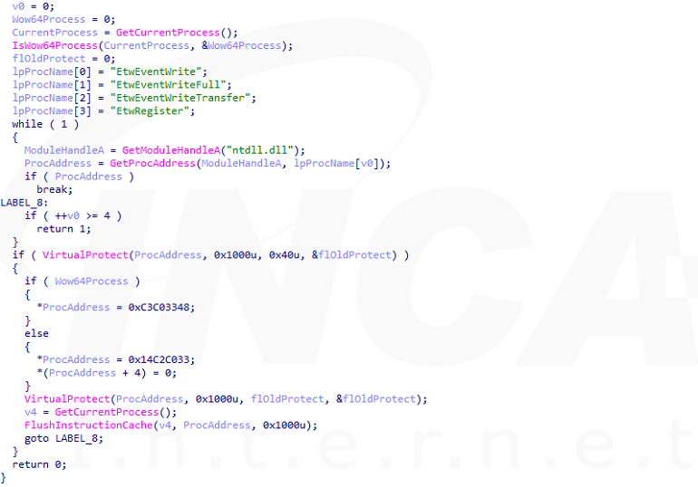 Payload 랜섬웨어의 실행 옵션 중 하나인 bypass-etw는 랜섬웨어에서 발생하는 윈도우 이벤트를 감지해 차단하는 ETW(Event Tracing for Windows) 기반 차단을 우회하는 옵션이다. VirtualProtect 함수를 호출해 ETW 함수가 위차한 메모리 영역의 보호 속성을 쓰기 가능한 상태로 변경한 뒤 CPU 아키텍처에 따라 Opcode를 실행해 ETW 함수의 메모리 시작 주소의 반환값을 0으로 패치한다.