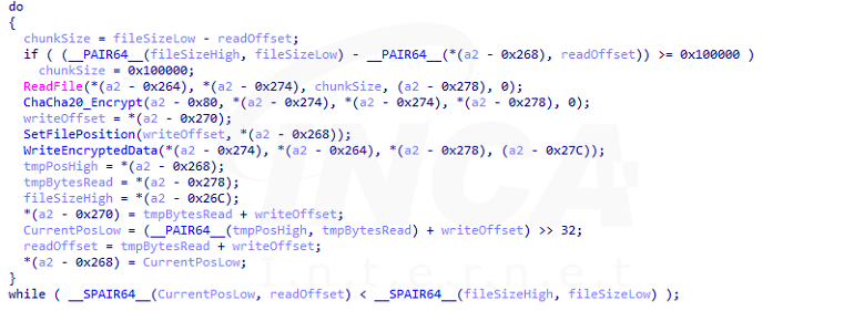암호화 과정에서는 CryptGenRendom 함수로 32바이트의 난수를 생성한 뒤 타원 곡선 암호화 알고리즘인 Curve25519(X25519)로 암호화 키를 생성하고 알고리즘의 형식에 맞춰 비트 클램핑을 진행한다. 이후 공격자의 공개키로 연산해 암호화 키를 생성하고 ChaCha20 알고리즘으로 파일을 1MB씩 암호화한다.