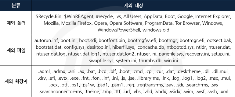 Payload 랜섬웨어를 콘솔 형태로 실행하면 동작 결과를 출력하며 파일을 암호화하고 랜섬노트를 생성하는데 아래 [표 1]의 항목은 암호화 대상에서 제외한다. 생성하는 랜섬노트는 RC4로 암호화됐으며 암호화 키와 암호문은 Base64로 인코딩된 상태로 랜섬웨어 내에 저장돼있다. 복호화된 랜섬노트는 C:\ 경로에 RECOVER_payload.txt 파일명으로 생성한다.
