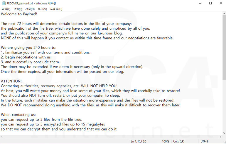 Payload 랜섬웨어는 파일 암호화 이전에 피해 시스템의 주요 데이터를 탈취한 뒤 암호화와 데이터 공개 위협을 동시에 가하는 이중 갈취 전략을 사용한다. 탈취한 데이터는 공격자가 Tor 네트워크상에서 운영하는 데이터 유출 사이트에 일부 공개하며 피해자에게서 연락이 없을 경우 원본 데이터를 추가 공개한다.