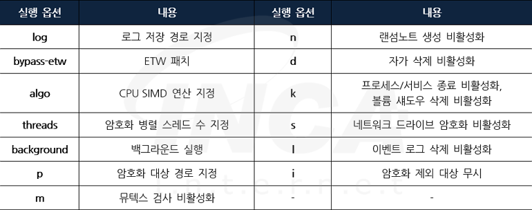 Payload 랜섬웨어는 콘솔 실행 시 다양한 인자값을 지원하며 암호화 대상 경로와 병렬 스레드 수 지정하거나 암호화 제외 대상을 무시하는 등 주요 악성 동작의 실행 여부와 세부 파라미터를 설정할 수 있다.