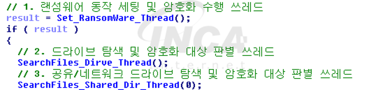 암호화 준비를 마치면 본격적으로 암호화 루틴을 수행한다. 암호화는 세가지 쓰레드를 생성하는 멀티 쓰레딩 기법을 사용한다.