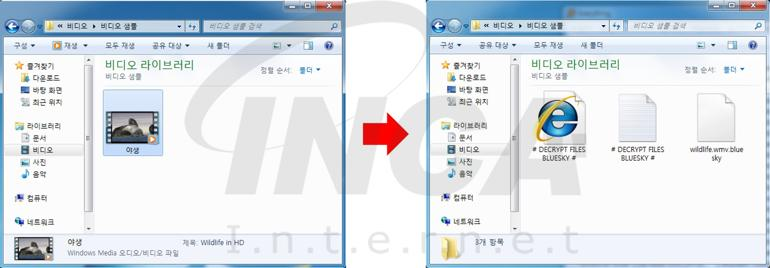 “BlueSky” 랜섬웨어에 감염된 화면은 아래와 같이 파일 확장자 뒤에 ‘.bluesky’ 확장자를 추가한다.