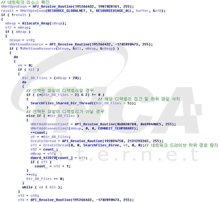 네트워크/공유 드라이브 탐색 및 암호화 대상 파일 판별 쓰레드는 두번째 쓰레드와 마찬가지로 네트워크 및 공유 드라이브에 관한 탐색 및 암호화 대상 파일을 판별한다.