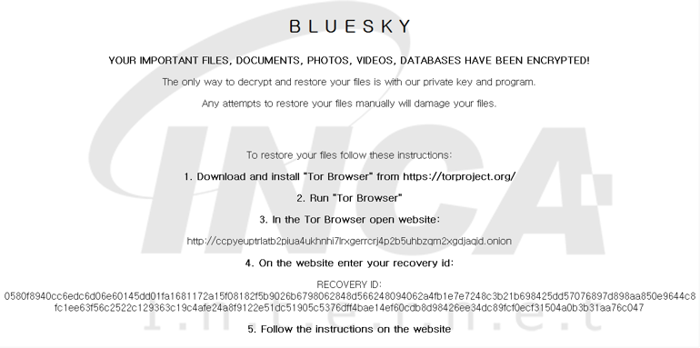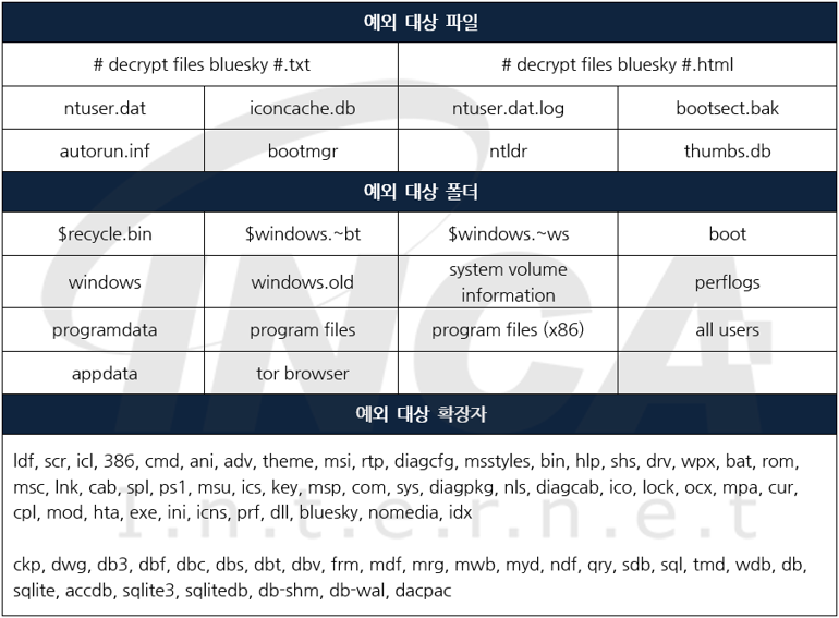 이후, “# decrypt files bluesky #.txt”, “# decrypt files bluesky #.html”라는 이름의 랜섬노트를 드랍한다.