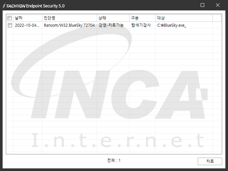 상기 악성코드는 잉카인터넷 안티바이러스 제품 TACHYON Internet Security 5.0에서 진단 및 치료가 가능하다.