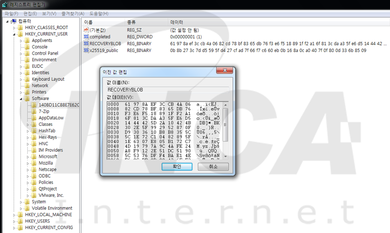 이후, 해당 32바이트의 랜덤 값으로 된 이름의 레지스트리를 “HKCU\Software\” 경로에 생성하고, 추후 복호화에 필요한 키 값을 저장한다.