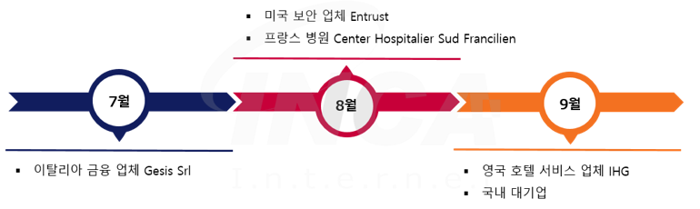 2022년 3분기(7월 1일 ~ 9월 30일) 동안 랜섬웨어 동향을 조사한 결과, 국내/외에서 “락빗(LockBit)”, “라그나락커(RagnarLocker)” 및 “하이브(Hive)” 등의 랜섬웨어로 인한 피해가 다수 발견됐다. 7월에는 미국 유통 업체 Gensco가 “라그나락커(RagnarLocker)” 랜섬웨어 공격을 받았고, 8월과 9월에는 미국 보안 업체 Entrust와 프랑스 의류 업체 Damart가 각각 “락빗(LockBit)”과 “하이브(Hive)” 랜섬웨어 공격을 받아 피해가 발생했다.