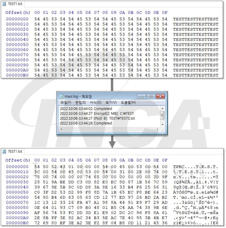 Maui 랜섬웨어를 사용하면 다음과 같이 암호화 되며, 로그 파일을 생성하여 암호화 대상 파일에 대한 정보를 저장한다.