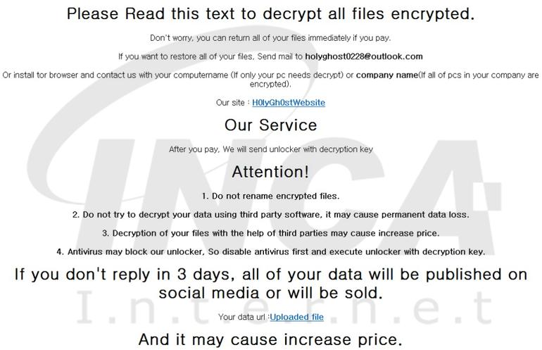 H0lyGh0st 랜섬웨어 감염되면, 다음과 같이 랜섬노트가 나타나며 암호화 해제를 위한 돈을 지불하도록 유도한다.