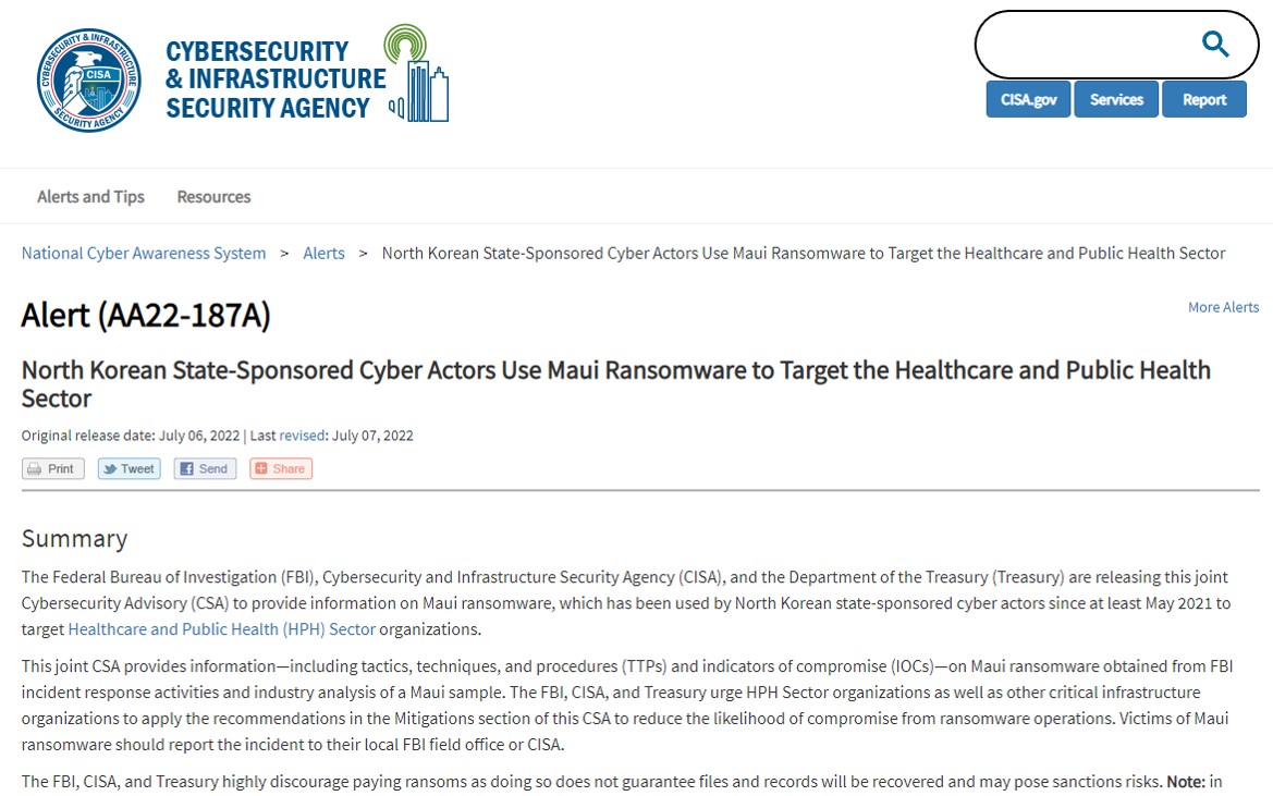 먼저, Maui 랜섬웨어는 2021년 5월부터 모습을 드러낸 것으로 전해지며, 미국의 보건 및 의료 관련 공공기관을 대상으로 공격하였다. 이에 대해 미국의 재무부를 포함한 FBI와 CISA에서 공동 사이버보안 권고(CSA)를 발표하였다.