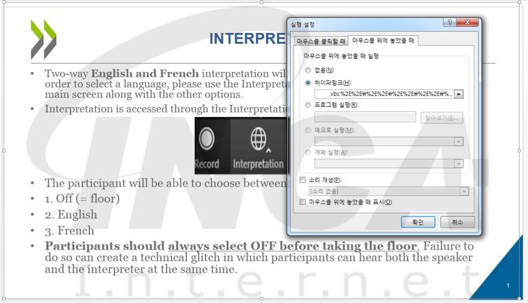 이번 3분기에는 해당 그룹이 새로운 공격 기법을 사용하여 주의를 주고 있다. FancyBear 그룹이 사용한 ‘HoverWithPower’ 공격 기법은 마우스 커서 메커니즘을 악용한 방법으로, 파워포인트 문서에서 악성 링크를 클릭하지 않고 커서를 올려 두기만 해도 링크가 실행된다. 아래의 그림과 같이, 슬라이드 전체 화면에 달하는 하이퍼링크를 삽입하여, 사용자가 해당 화면 위에 마우스를 올리면 바로 악성 스크립트가 실행되도록 하였다.