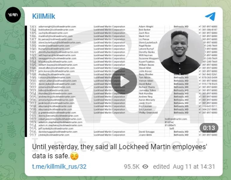 KillNet 그룹은 8월에 LockHeed Martin을 공격했다고 밝혔다. LockHeed Martin은 미국의 항공우주, 무기, 방위 기업으로 미군과 우크라이나군에 군용, 방위 장비를 공급하는 기업이다. 해당 해커그룹은 LockHeed Martin의 각종 정보를 탈취했으며, 탈취한 정보에는 직원 사진 및 이름과 같은 개인정보가 포함되어 있다고 텔레그램을 통해 전했다. 이들은 과거에도 텔레그램을 통해 공격사실을 밝힌 바가 있다.