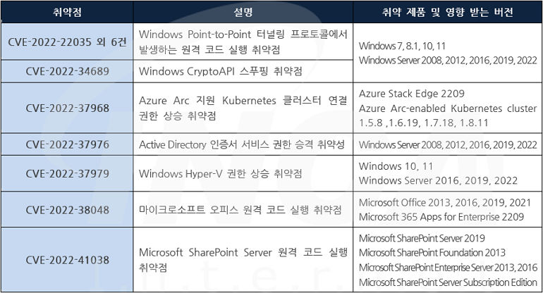 Microsoft 사는 제품에서 발생하는 취약점에 대한 보안 업데이트를 발표하고, 관련 취약점을 해결하기 위해 최신 버전으로 업데이트할 것을 권고하였다.