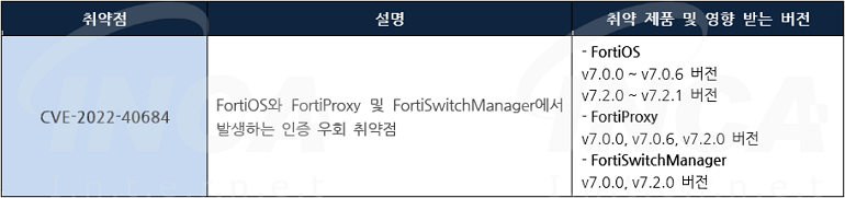 Fortinet 사는 제품에서 발생하는 취약점에 대한 보안 업데이트를 발표하고, 관련 취약점을 해결하기 위해 최신 버전으로 업데이트할 것을 권고하였다.