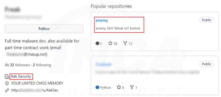 “EnemyBot” 악성코드는 소스코드와 함께 발견 되었는데, 게시자는 스스로를 “Kek Security” 소속의 악성코드 개발자라고 밝히고 있다.