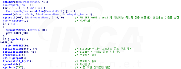 탐지를 방해하기 위해 프로세스에 대한 상태 확인 및 제어 관련 함수인 prctl 을 이용하여, 프로세스 명을 ‘임의의 12자리 문자열’로 변경한다.